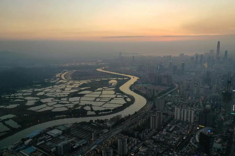 香港新界北,与深圳交界处,有一个人迹罕至的“世外桃源”——马草垄。日光下,波光粼粼的鱼塘、四周的农田与远处的现代建筑交相辉映;夕阳西下,鱼塘和相邻的深圳河化作调色盘,展现不同的色泽,由明亮至浓烈,映照出深圳福田高楼的璀璨霓虹。