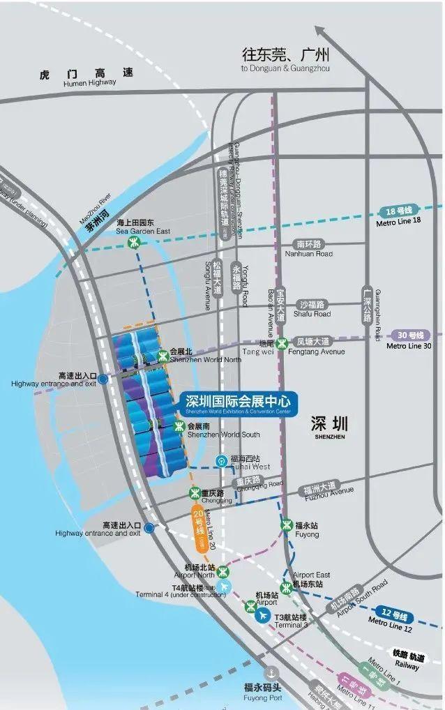 配备智慧公交,接驳地铁11号线塘尾站和机场,在展馆和周边的地铁站、巴士场站、商业中心区、酒店等地往返。