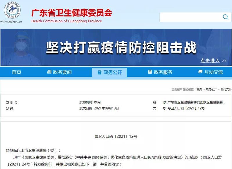 9月13日,广东省卫生健康委官网发布通知,对《广东省人口与计划生育条例》(下称《条例》)、生育登记管理办法等各项法规、政策修改和实施前的过渡期间,三孩生育登记业务和生育假期执行方案进行明确。