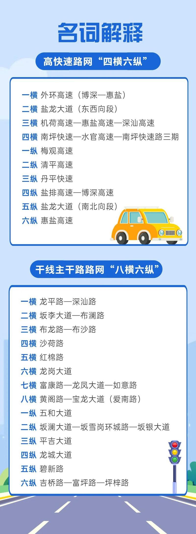 随着上述高快速路项目的完工,龙岗高快速路网由“二横五纵”优化为“四横六纵”格局;盐排高速、清平高速二期、东部过境通道等高速公路实现免费通行,进一步强化了高速对沿线片区的服务并降低了出行成本;坂银大道、红棉路、恒心路(平大路—凤平路)段、富康路跨铁路桥、西宝线改扩建、碧新路北段、华为立交F匝道、沙荷盐排立交等道路新改建完工,进一步充实完善了“八横六纵”的干线主干路路网。
