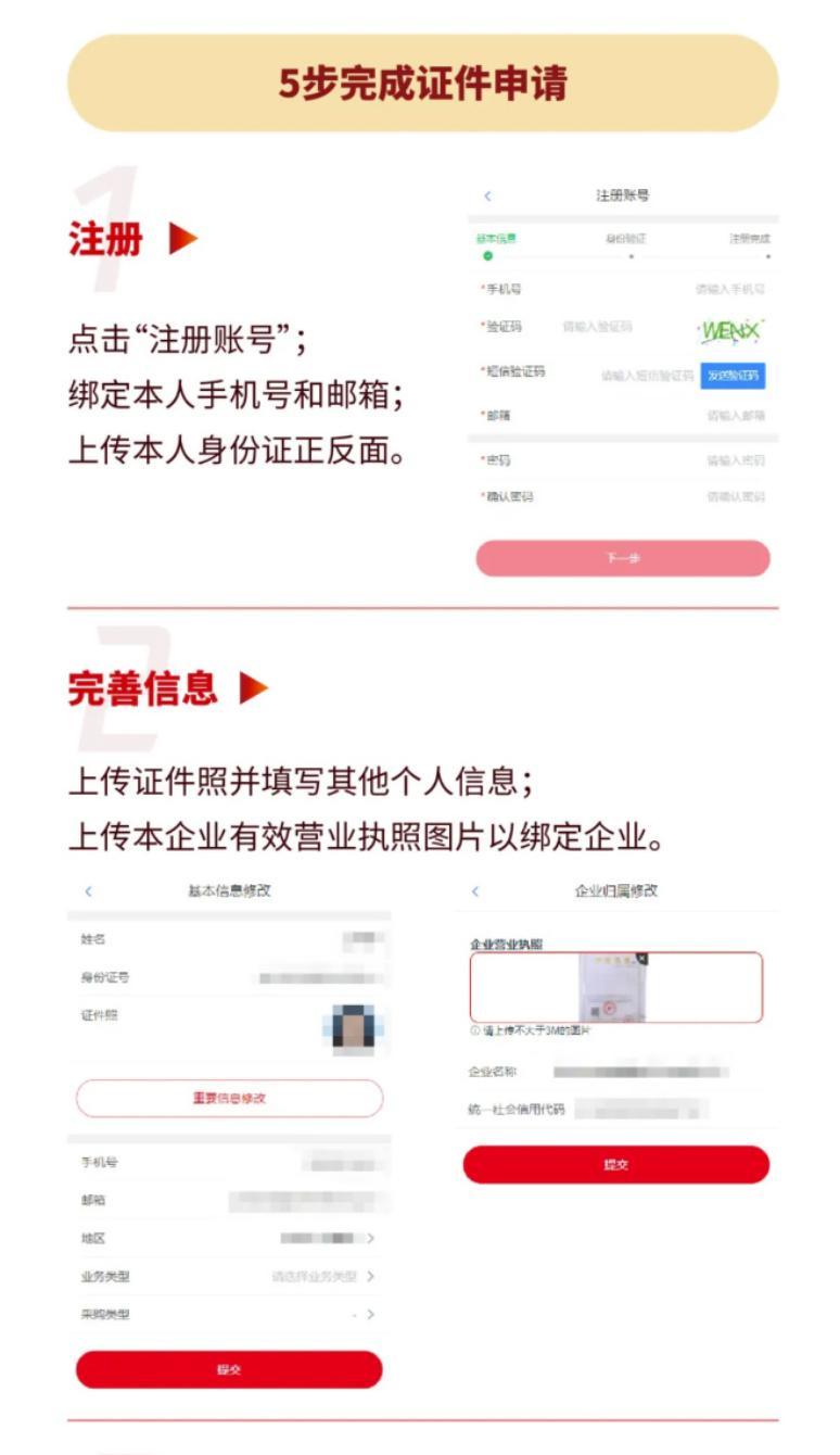 1、采购商个人线上递交申请资料(身份证正反面、所在公司营业执照、蓝白底免冠证件照);