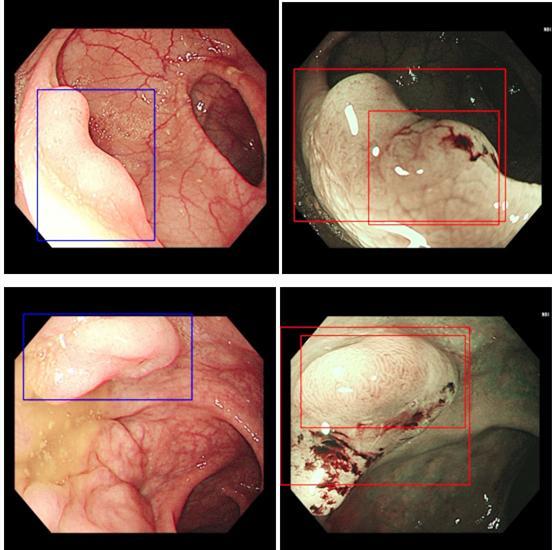同时,当视野中出现异常时,“内镜精灵”会用蓝框标记,提示“疑似息肉”;当有癌变倾向的高风险病灶时,标记框则变为红色,并提示“疑似肿瘤”,并有语音提示“高风险病灶,建议活检”。