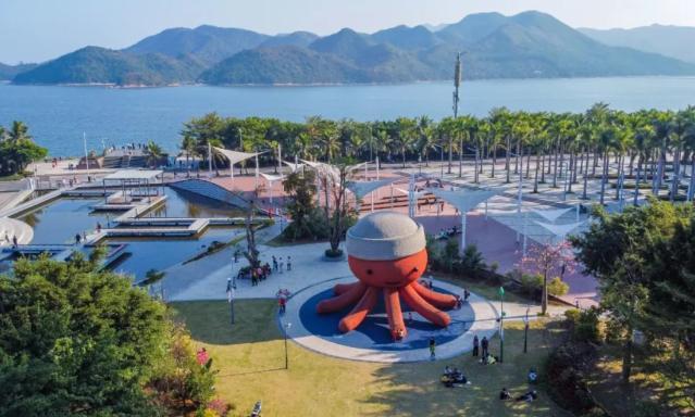 从地铁8号线海山站B口出来,沿着海山路直行到海景二路,五分钟,便可看到一个巨型编织建筑——头戴圆帽憨态可掬的红色章鱼正微笑相迎,这是盐田中央公园的标志性打卡胜地。