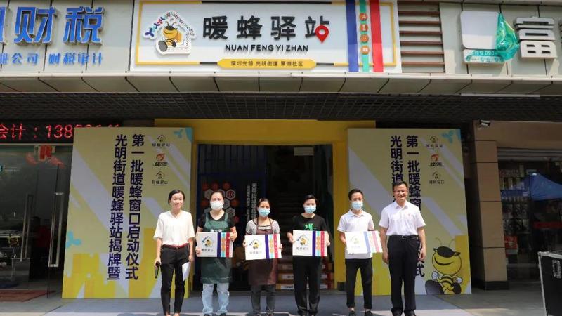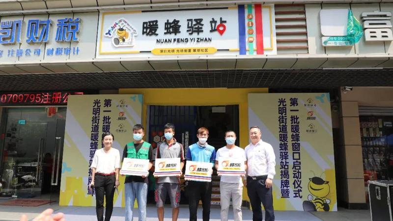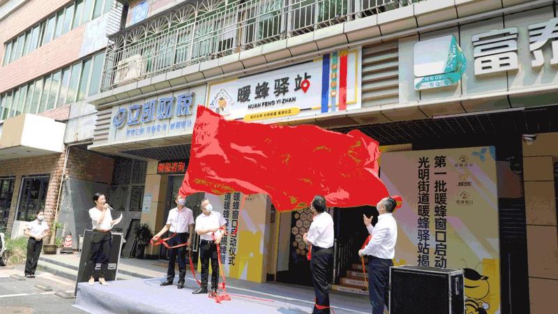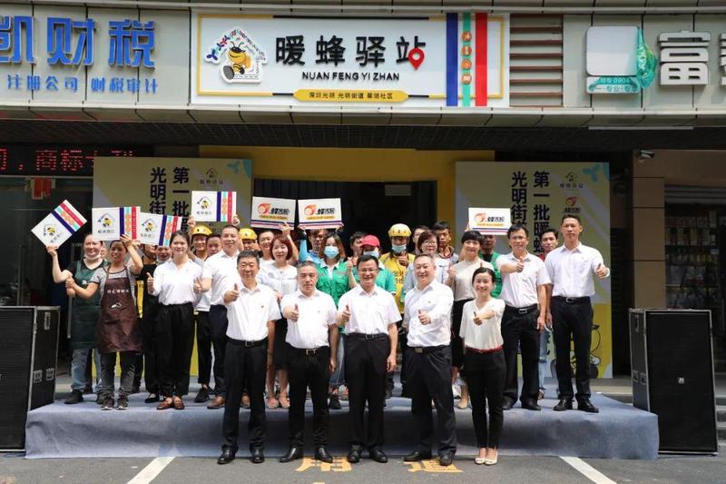 光明街道坚持党建引领,建立新兴领域党、团、工会组织,引入业界资质好、经验基础好、服务口碑好的爱心商家、平台企业、行业商会等社会力量,如“V爱之家”、“红小二”服务队、聚光联盟—光明社区治理服务联合体、“暖蜂窗口”商户等,组建暖蜂联合体。