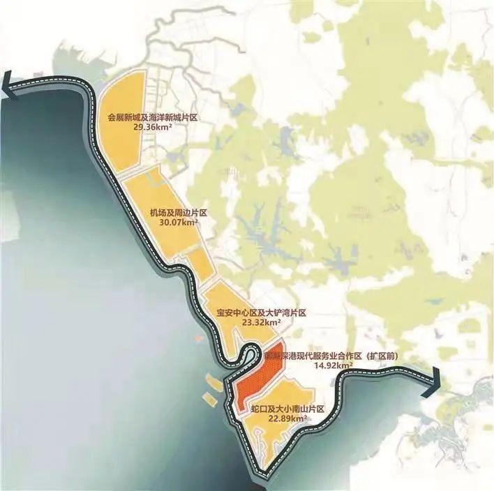 ◎面积:22.89平方公里 范围:东至后海大道、近海路、爱榕路、招商路、水湾路,南至深圳湾,西至月亮湾大道、珠江口,北至东滨路,包含中国(广东)自由贸易试验区的蛇口区块