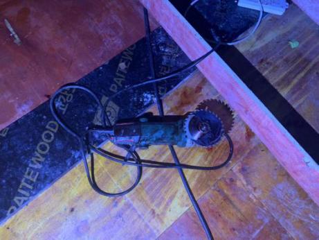 由于使用的梯子的高度不足,涉事人员为了能够将天花板的木板锯下,将手越过肩膀进行天花板木板切割,造成了涉事人员的力量不能完全控制在角磨机上,当角磨机锯片破裂发生弹跳造成工人手部未能握紧,角磨机由于重力势能在掉落过程中便锯伤工人脖子,从而也导致了事故的发生。