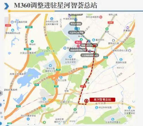 M360线路一端总站由龙岗信息学院总站调整为星河智荟总站,双方向增加“荷坳地铁站、水晶之城”等2对公交停靠站,往星河智荟总站方向增加“大运地铁接驳站②、大运地铁站”等2个单边公交停靠站,取消“龙岗COCOPark西、大运地铁接驳站③”等2个单边公交停靠站,往龙华公交总站方向增加“大运地铁站②、大运地铁接驳站①”等2个单边公交停靠站,取消“大运地铁接驳站④”1个单边公交停靠站,往龙华公交总站方向服务时间由06:30-22:20时调整为06:00-21:40时。