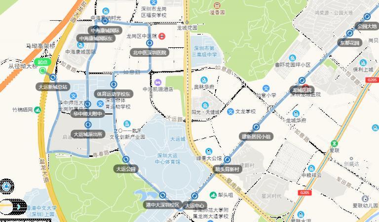 往深圳实验坂田校区方向部分途经道路由坂澜大道、吉华路调整为环城路,往坂田五和总站部分途经道路由龙颈坳路、布龙路调整为环城路、吉华路。