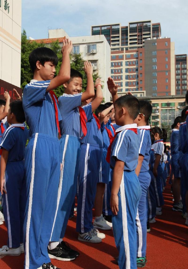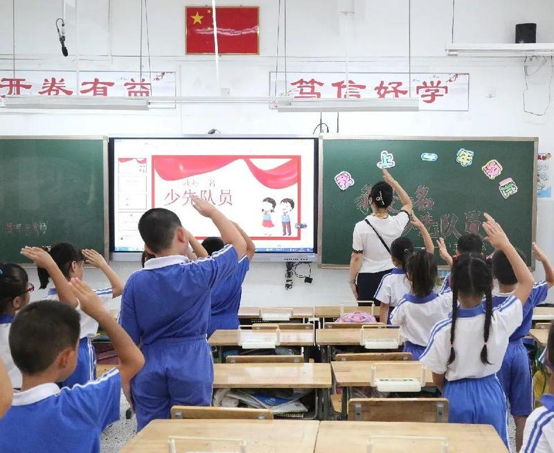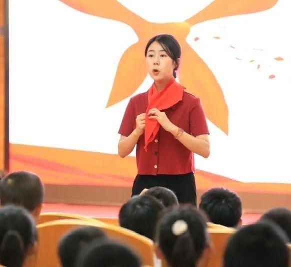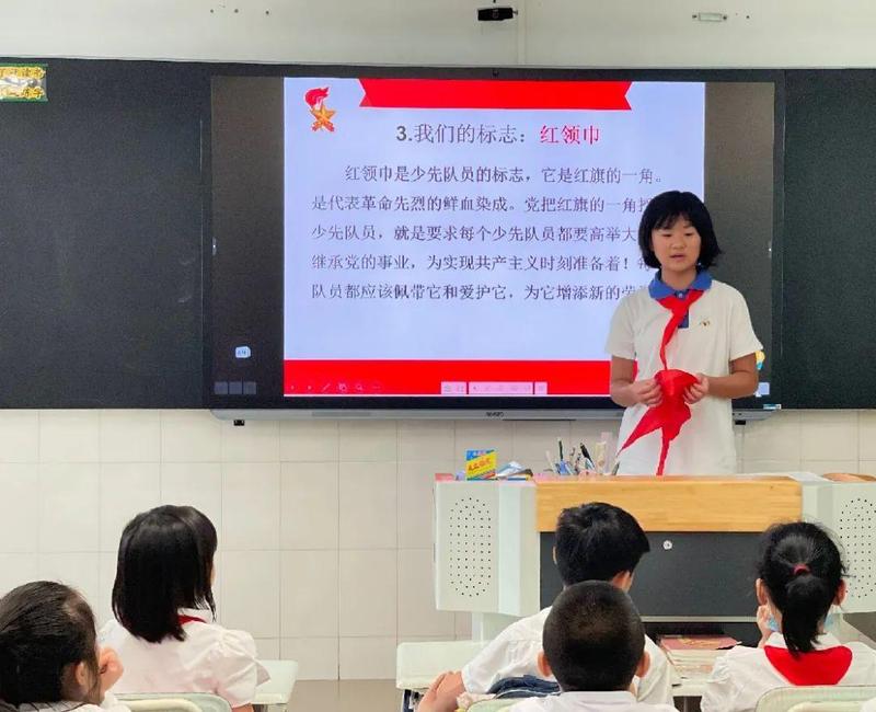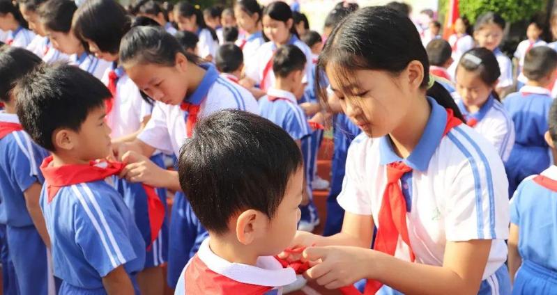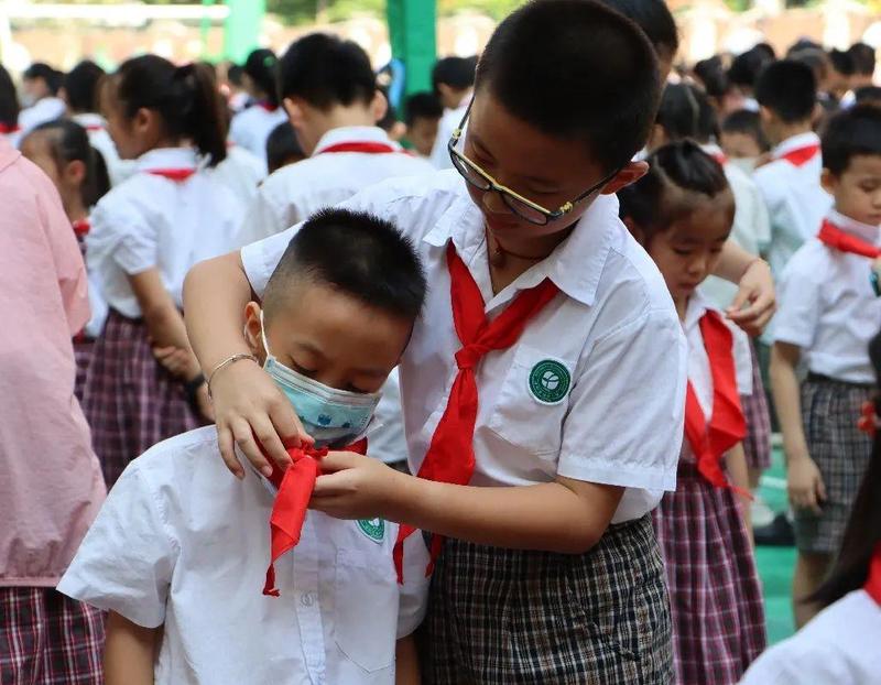 授红领巾,宣誓呼号。五年级的哥哥姐姐鱼贯入场,为新队员佩戴红领巾。领巾披身,互行队礼,少先队员的精神在新老队员间传递。在大队长乔梓琪的带领下,少先队员举起右手,庄严宣誓:“好好学习、好好工作、好好劳动,准备着,为共产主义和祖国的伟大事业,贡献出一切力量!”