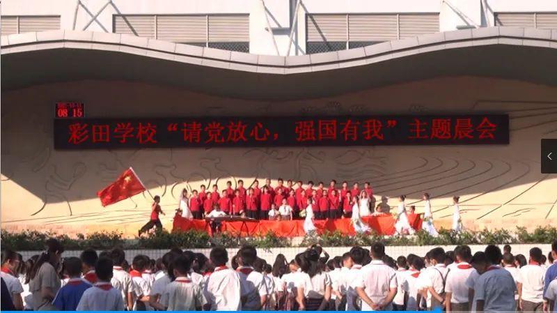 彩田学校第七周“请党放心,强国有我”主题晨会。彩田学校全体师生在操场参加第七周“请党放心,强国有我”主题晨会,三4中队表演歌舞《少年行》,让队员们懂得了站得高才能看更远,更领悟到了只有爱我们的国家才能更好地保护他人。