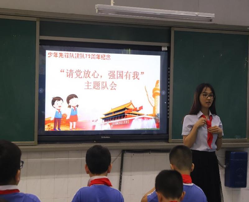 为迎接中国少年先锋队建队日,激发少先队员的爱国爱党热情, 引导少先队员深入了解党的历史, 领悟党的精神,切实增强广大少先队员的历史责任感和使命感,充分发挥少先队的思想引领作用,学校组织全校少先队员开展“请党放心,强国有我”主题中队会。