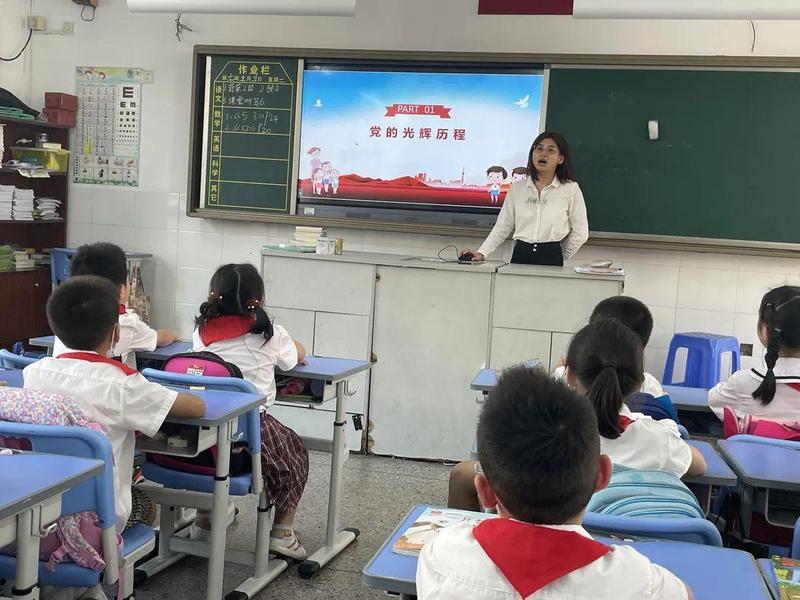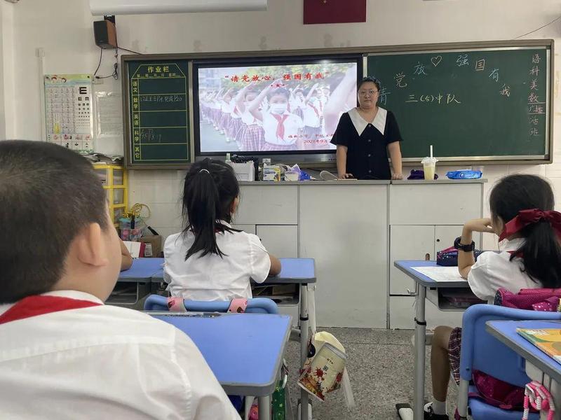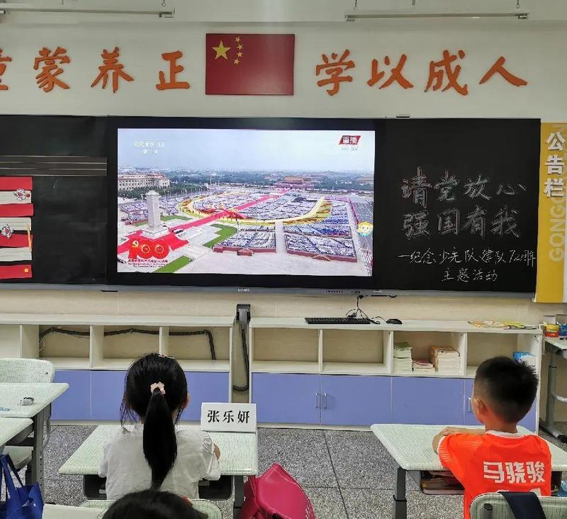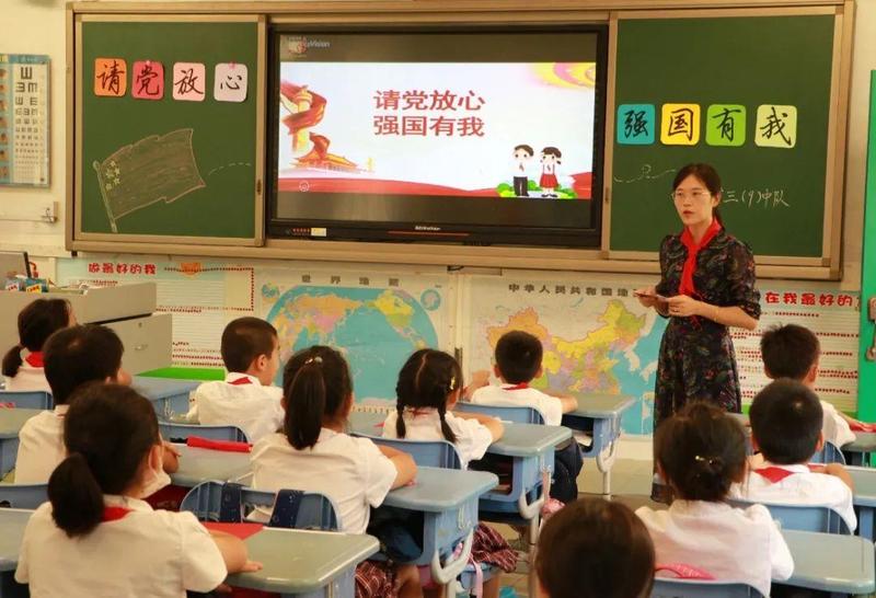 各个班级观看庆祝中国共产党成立100 周年大会,队员们大声跟唱着《没有共产党就没有新中国》,并在最后连呼四遍,“请党放心,强国有我”。八字誓词铿锵有力,中队辅导员们为少先队员们讲述党史,队员们聆听党员楷模的故事,学习党的光辉历史,缅怀先烈,致敬革命英雄,学习他们无私奉献,不畏苦难,勇往直前的精神,坚定从小听党话、跟党走的决心,争做新时代好队员。