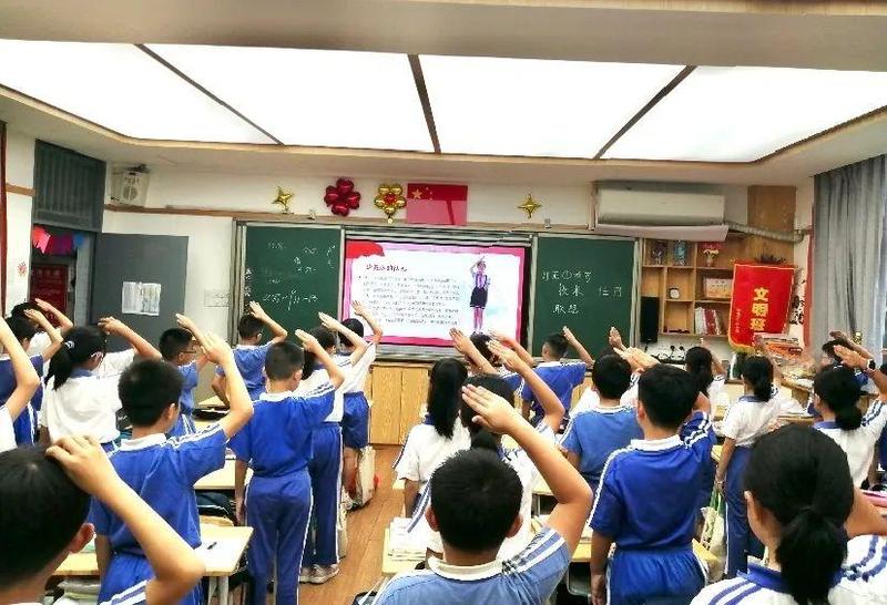 队旗飘扬 放飞理想。出旗曲庄严响起,旗手们手持队旗,昂扬前进。火红的队旗飘扬,鲜艳的红领巾系满理想。300多名今日入队的学生站姿笔直,注目队旗,齐唱队歌,明亮的眼睛里闪耀着对红领巾的期待和红色的理想。