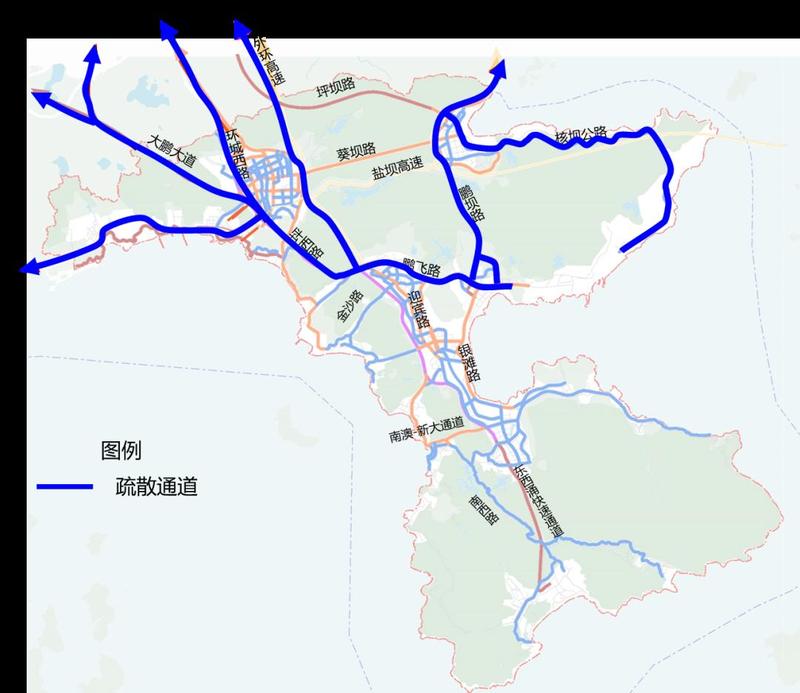 以海空交通为辅,道路交通为主,构建东、中、西三个方向应急道路疏散通道,满足大鹏半岛应急疏散要求。