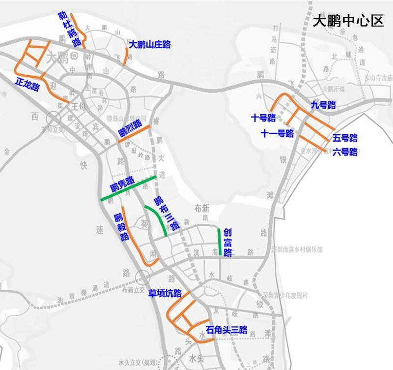 重点加快外环高速大鹏新区段、大鹏大道、盐坝高速市政化改造工程对外通道规划建设,构建“三横两纵一圈”干线路网结构。