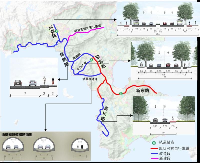 以打造东部滨海旅游公路为契机,加快环大鹏湾海岸公路慢行系统建设,推进宝石路、葵鹏路、油草棚隧道自行车道方案。