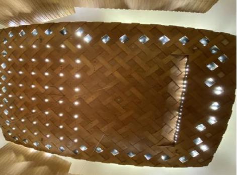 演艺厅的地板设置成12块等标高的可升降平台,独奏会的时候,只升起舞台中央部分,观众可以坐在四周。这样的划块使得演员与观众的距离进一步拉近,融为一体。舞台的多样化满足各种不同的表演形式的需求。演艺厅的地板采用厚达50mm日本北海道扁柏木,墙面反声板外表不规则并向外倾斜5度,达到墙面反声板完美效果的同时,使观众在静止的时空里与音乐共存。