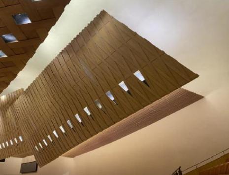 观众席整体排布立体又具有亲和力,并以表面不规则的独立墙分割,每一块都有效提升厅内的声音反射。舞台地板采用厚达50mm日本北海道扁柏木,使舞台上的演奏家能够享受到极佳的返听效果。墙上6块经过周密的角度计算的大型反声板,均衡地传递反射声音到音乐厅中的每一个座位,为演出产生最佳的声学效果。