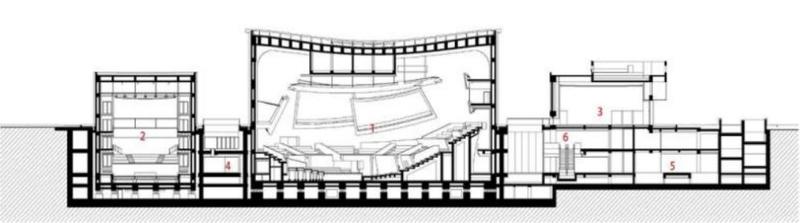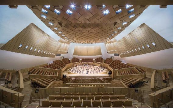 1200 座的主厅采用葡萄园式构造,建筑设计服从建筑声学设计,声学理念是将音乐厅本身作为一件极佳的乐器,采用1:10模型进行电脑仿真测试和精密计算。