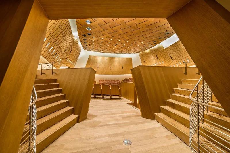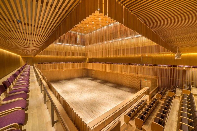 可容纳400座的演艺厅拥有完美的体量比例关系,配备了领先的录像转播和录音设备,可作为演出形式多样的高品质录音棚来使用。为了使演艺厅的音效更加完美,还在观众席围栏外沿布满了条状的声学饰面。