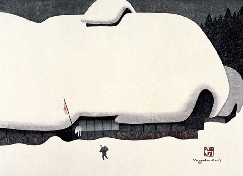 再如《会津之冬》系列的部分作品,斋藤清也充分利用了东方绘画独有的散点透视,平铺画面,不去刻意博取眼球,只做单纯的叙述。厚重而寒冷的积雪掩埋着乡村的小木屋,但在大山环抱下,一整个村庄似乎又显得温暖祥和,仿佛能看到小木屋中人们拉扯出的家长里短。