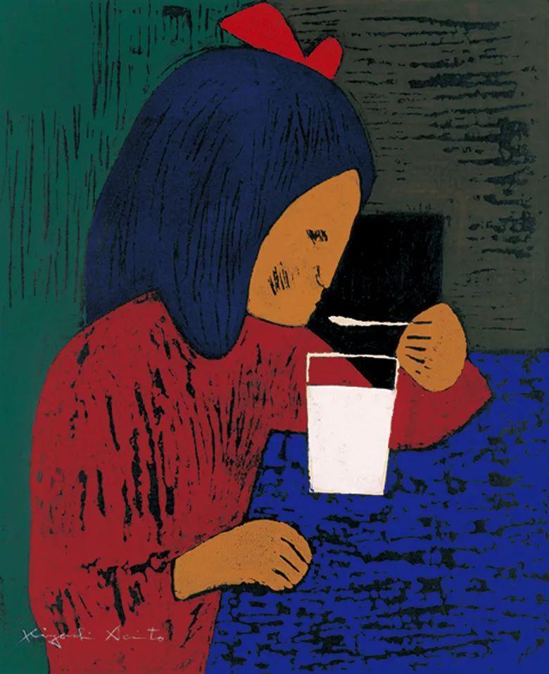 斋藤清在追求简单的图形与构图的同时,着眼于版材带来的丰富表现,会运用不同材料的肌理去表现画面。将木纹的肌理用在表现动物的毛流、水流,甚至能自在地描绘出人物内在情感。