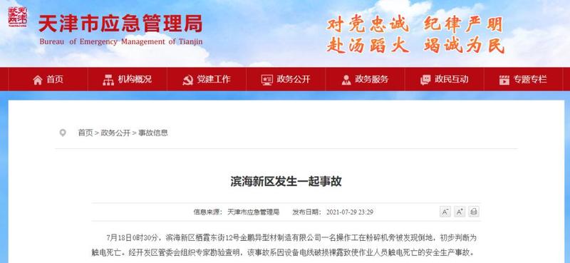 2021年7月18日,天津一家公司的一名操作工在粉碎机旁被发现倒地,初步判断为触电死亡。经勘验查明,系因设备电线破损裸露致使作业人员触电死亡的安全生产事故。