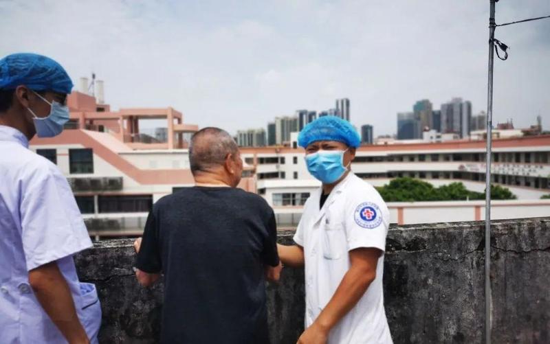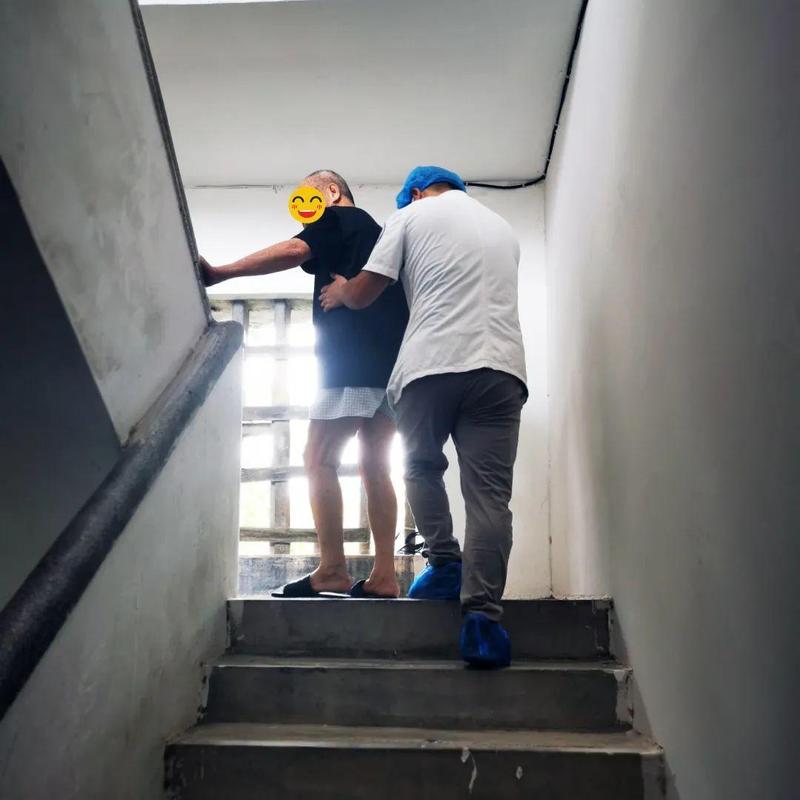 第2个月,上门的医务人员还有了意外惊喜。老人家住在6楼,往下走6层去楼下活动有难度,但是往上走1层去天台活动却可行,于是,他们尝试着带老先生去天台走走,许久不曾出门的老先生就像初入大观园“刘姥姥”,这边看看,那边瞅瞅,新鲜极了。