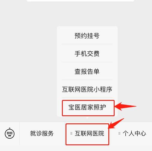 ①关注“宝安人民医院集团”微信公众号,点击菜单栏“互联网医院”,选择“宝医居家照护”。