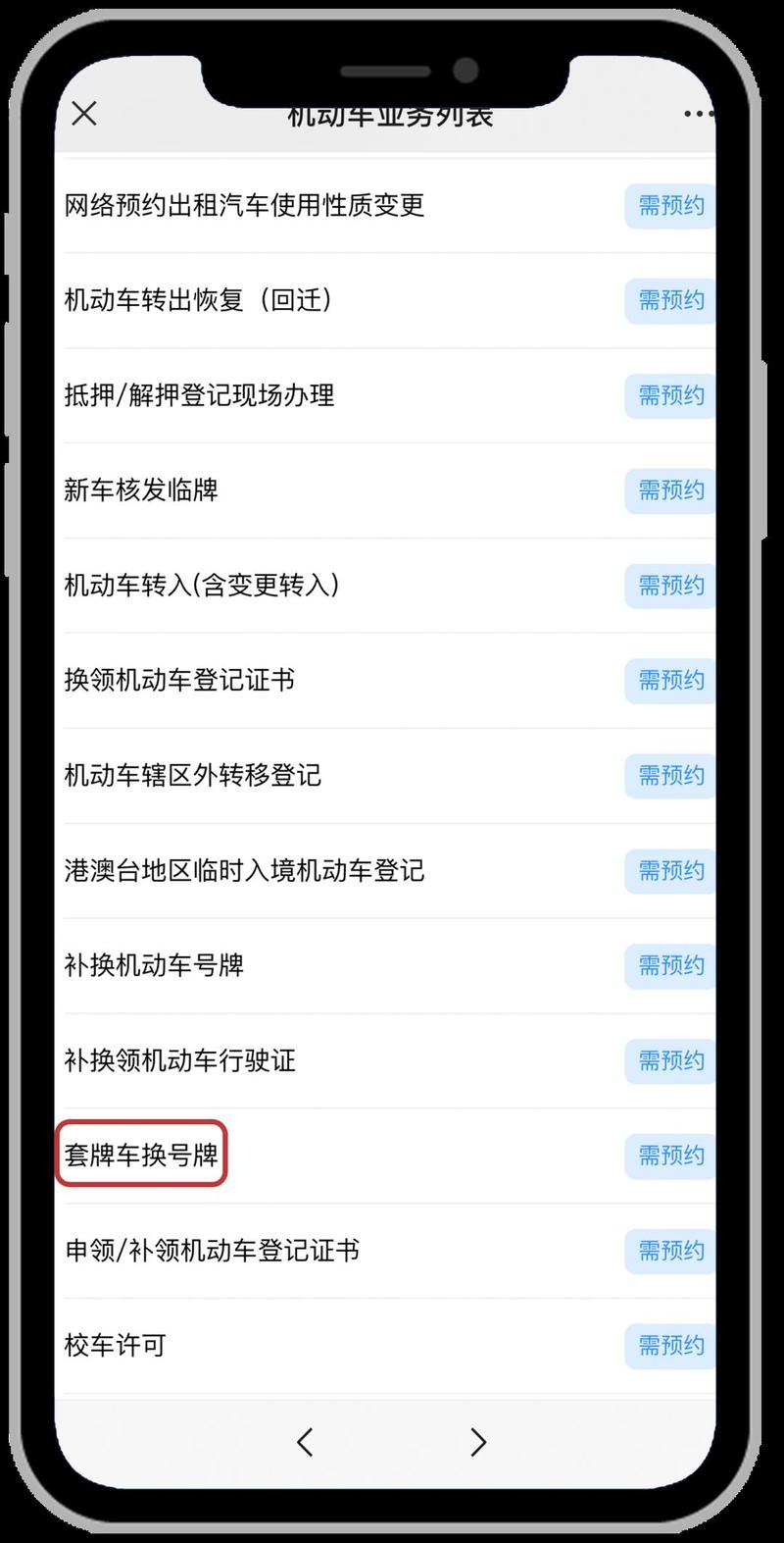 关注“深圳车管所”微信公众号,注册登录星级用户。在主页点击“更多业务”,在机动车业务板块预约“套牌车换号牌”。