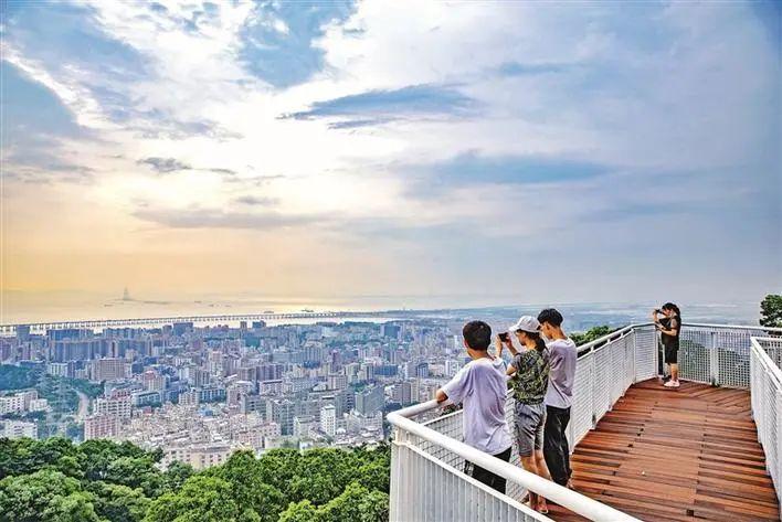 铁仔山公园,市民在栈道上鸟瞰大湾区风景。