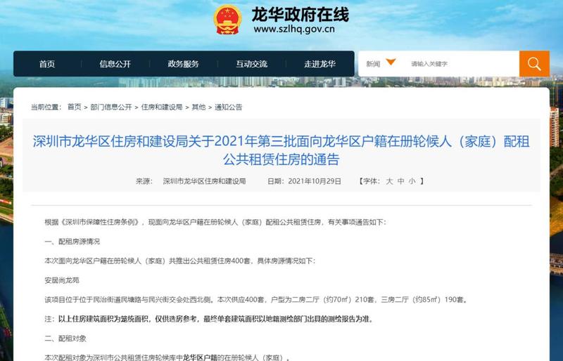 本次面向龙华区户籍在册轮候人(家庭)共推出公共租赁住房400套,具体房源情况如下: