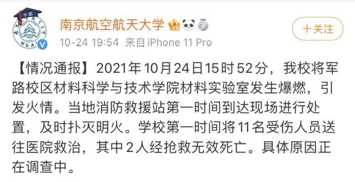 2021年10月24日15时52分,我校将军路校区材料科学与技术学院材料实验室发生爆燃,引发火情。当地消防救援站第一时间到达现场进行处置,及时扑灭明火。学校第一时间将11名受伤人员送往医院救治,其中2人经抢救无效死亡。具体原因正在调查中。