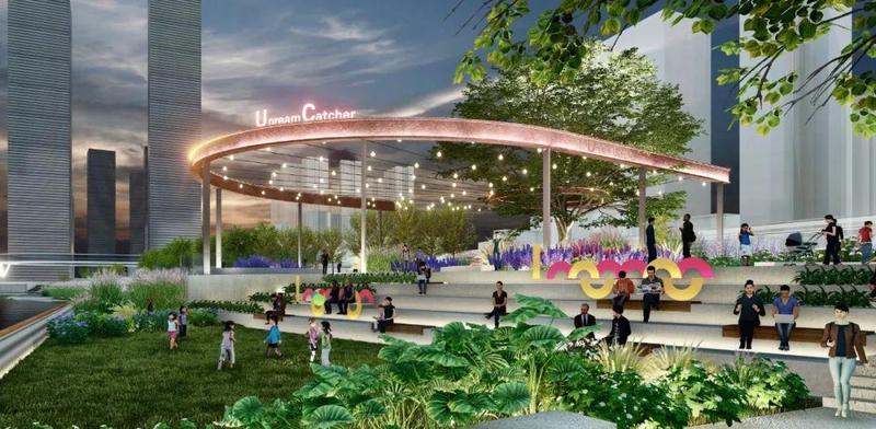 城市阳台是与U梦广场衔接的宜居段门户区段,周边毗邻商业地块和绿地空间,创造宽阔场地、举行主题和健身活动的适合场地。碧道在此区段强化了城市中心区段的可达性和参与性。