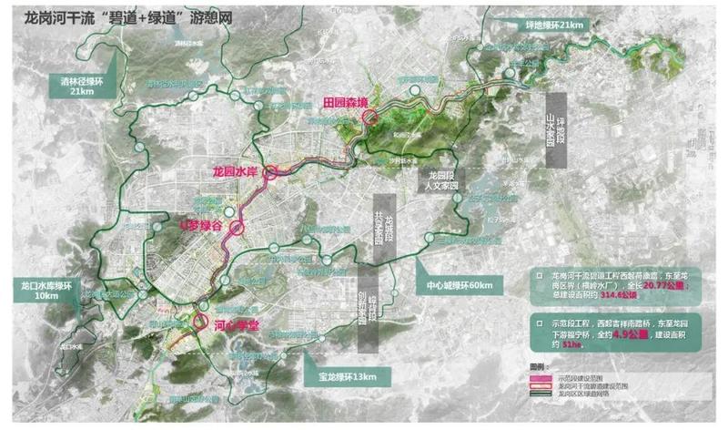 目前,龙岗河干流碧道先行开工建设的示范段,分为三大主题:U梦绿谷段、宜居生活段、龙园水岸段。