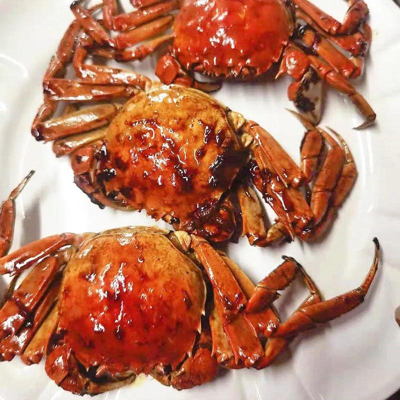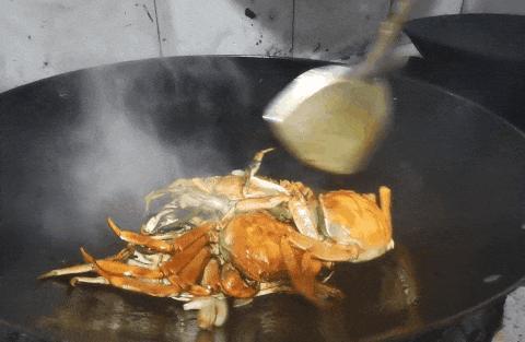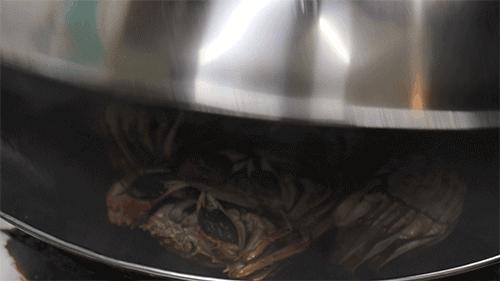 大闸蟹过滚油,姜葱、美极鲜焖煮入味