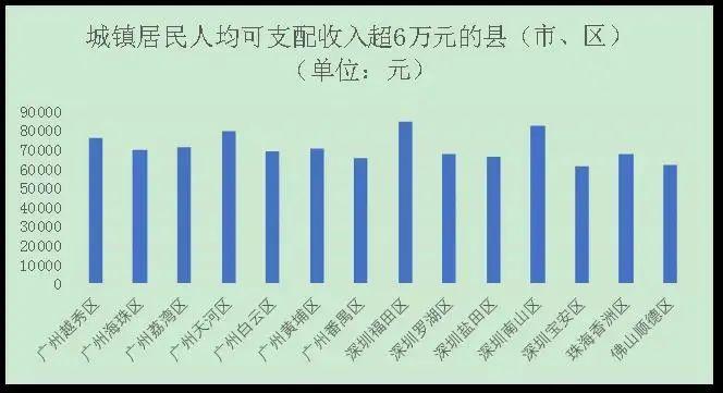 值得一提的是,从人均地区生产总值来看,深圳南山区、广州越秀区、深圳福田区分别以367233元、325608元、308072元位居全省前三,达到发达国家(地区)水平,而三区的城镇居民人均可支配收入分别位居全省第2、第4、第1。南山区综合实力连续三年位居全国百强区第一,拥有一大批全国知名企业。福田区拥有商事主体近50万,创业密度居全国之首,其中本土世界500强企业4家,占深圳一半。越秀区则是广州最古老的中心城区,现代服务业发达,税收亿元楼宇达65栋,同时拥有高新技术企业超600家。三区经济的高质量发展,为提高居民收入创造了空间。