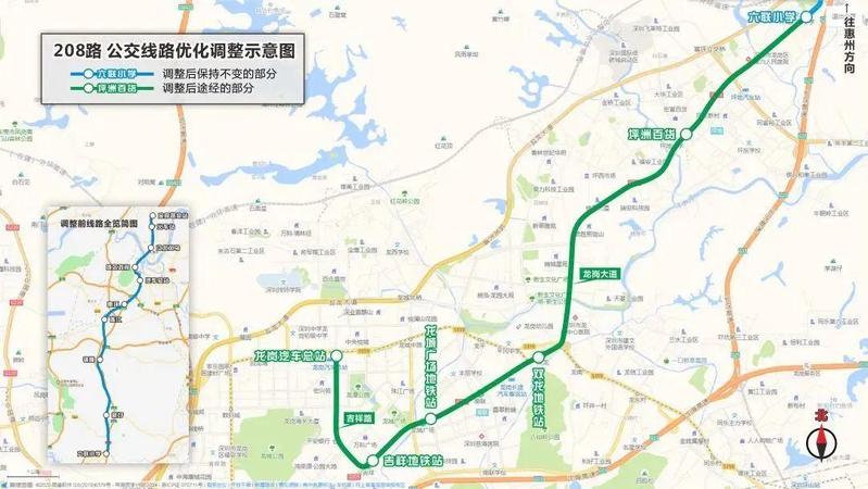 延长后的惠州208线,将在双龙地铁站①、龙城广场地铁站①、吉祥地铁站①等3个站点,无缝接驳深圳地铁3号线,无需在六联小学转车;同时线路延伸至龙岗汽车总站,在龙岗中心区可通过208线直达惠州市惠城区,更方便深惠两地市民跨市出行。
