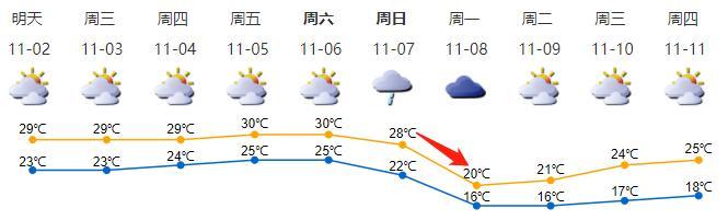 ☑ 11月8日阴天间多云,局部有小雨,气温明显下降,天气明显转凉,最低温可降至16℃左右。
