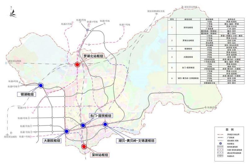 4 个城市枢纽:大剧院枢纽、东门-国贸枢纽、湖贝-黄贝岭-文锦渡组合枢纽、银湖枢纽。