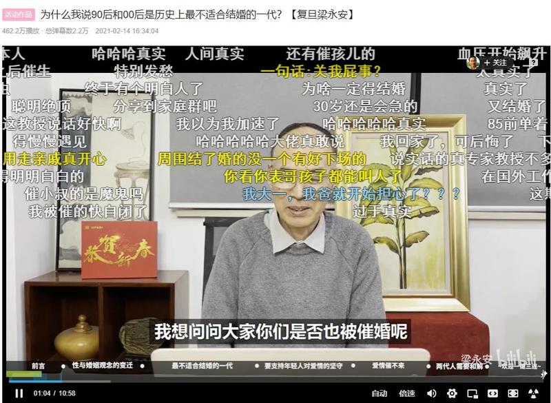 由于旁征博引、金句频出、共情满分……梁永安的爱情视频课播放量很快超过千万。年轻网友们用满屏的“弹幕”捧场,“弹幕”中也充斥着当下青年对于“爱情”的向往、踟蹰、纠结与逃避。