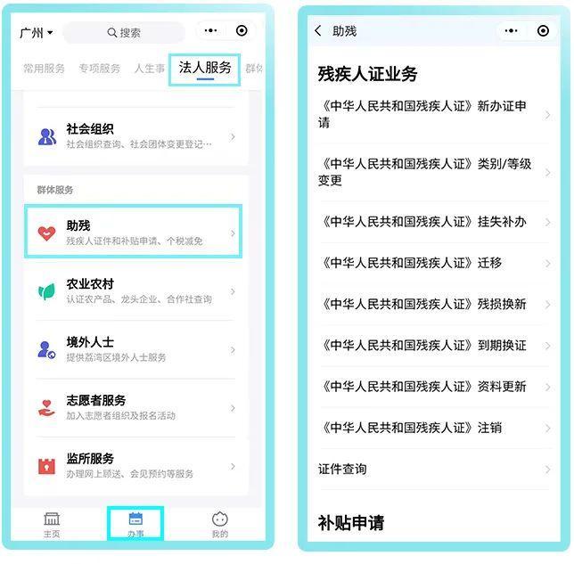 微信搜索登录粤省事小程序,点击首页下方“办事”页,下拉点击“助残”,选择所需服务办理相关业务。