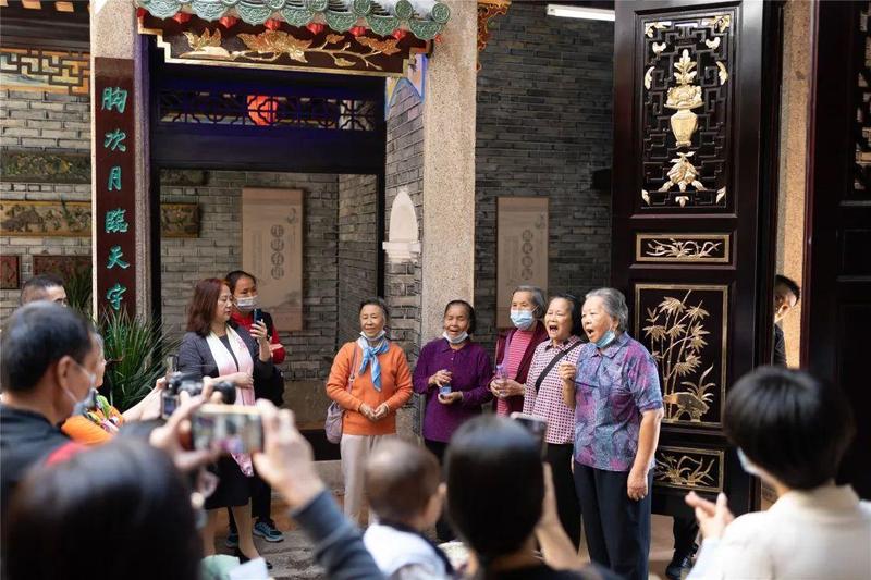 寻访团成员们一来到曾氏弼君公家塾,就受到了村民们热情的招待,玉律村也特别重视此次活动,玉律村文化宣传负责人曾旺发带领寻访团成员走遍附近的大街小巷,耐心而详细地介绍了此处历史遗迹,为寻访团还原了最本真的历史原貌。此外,玉律村文化宣传负责人还邀请到曾锦安、曾水明、曾丽好、曾石兴、曾球旺、曾淦辉、曾晚福等玉律村的老前辈们,其中还包括老教育工作者、村内祠堂守护者。他们现场为寻访团成员讲解村落历史,曾丽好作为解放后玉律粤剧团的主要成员还带领在场的老前辈们热情演绎本地山歌。现在说到玉律山歌,经过悠久岁月,会唱的玉律人已经凤毛麟角,这么多老前辈们一起演绎玉律山歌更是十分罕见的场景。现场的寻访团成员当然是不会放过这个珍贵的画面,纷纷拿起手机、相机记录,现场洋溢着发自内心的掌声、欢呼声,传统文化经过岁月的沉淀,越发深邃,越发动人。
