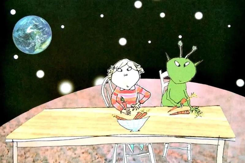 萝拉看着桌子,说:“可是,为什么这里还有胡萝卜呢,查理哥哥?我!永远!不!吃!胡萝卜!”