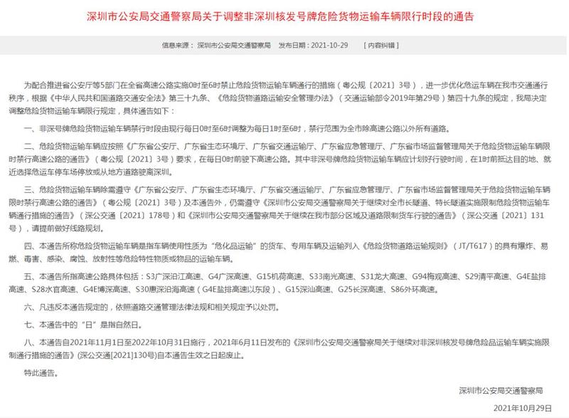 为配合推进省公安厅等5部门在全省高速公路实施0时至6时禁止危险货物运输车辆通行的措施,深圳交警于2021年10月29日发布《深圳市公安局交通警察局关于调整非深圳核发号牌危险货物运输车辆限行时段的通告》(深公交通〔2021〕224号)。