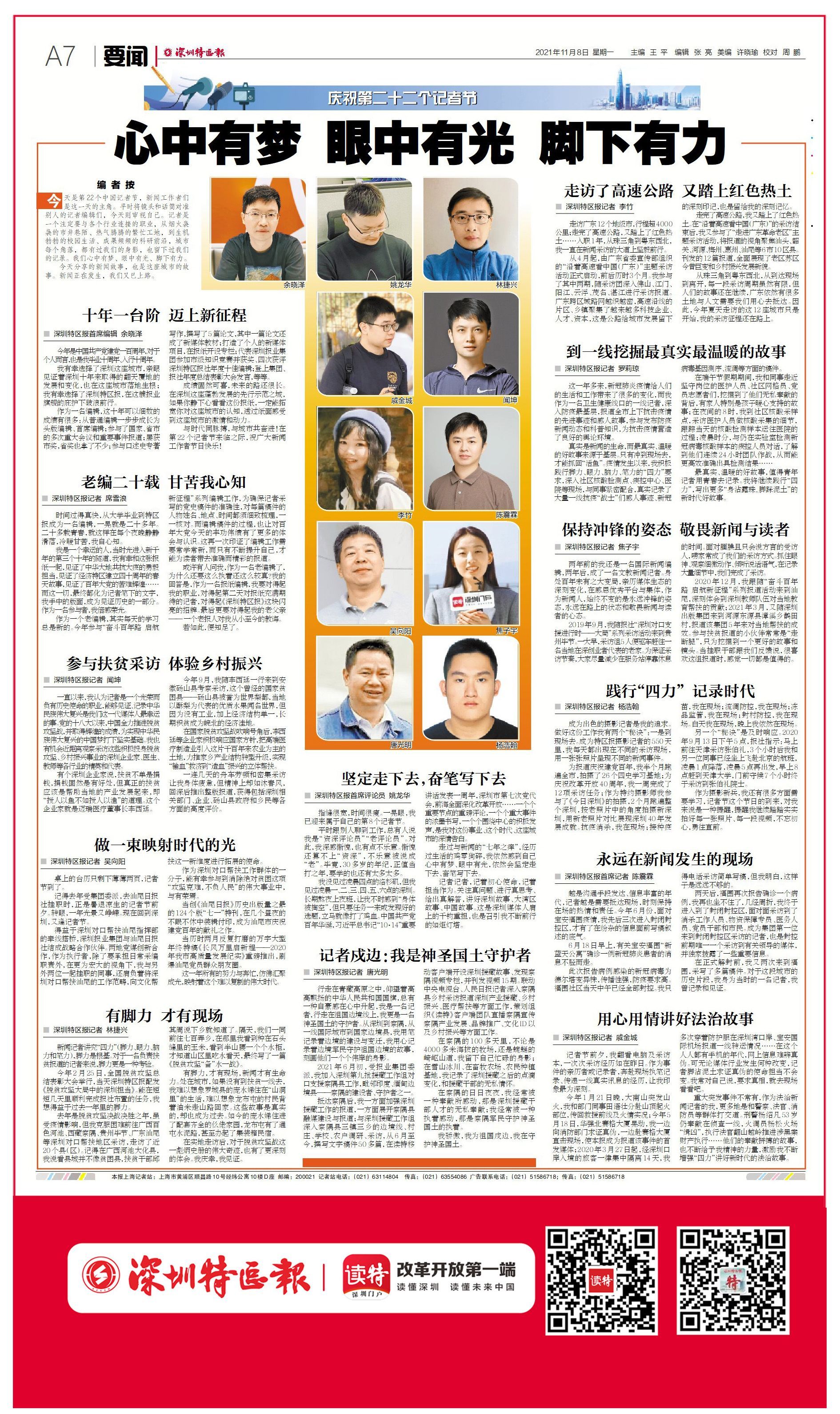 我是一个幸运的人,当时光进入新千年的第三个十年的隧道,我有幸和这张报纸一起,见证了中华大地共抗大疫的勇毅担当,见证了经济特区建立四十周年的春天故事,见证了百年大党的苦难辉煌……而这一切,最终都化为记者笔下的文字,我手中的版面,成为见证历史的一部分。作为一名参与者,我倍感荣光。