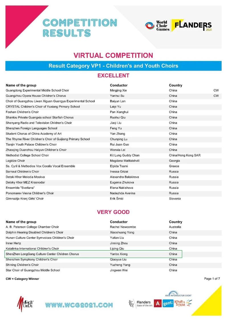 2021年11月7日,从世界合唱比赛官网上传来了好消息,龙岗区文化馆少儿合唱团凭借《时间都去哪了》《大鱼》《灯火里的中国》三首合唱作品,获得了比赛组别VP1“ 童声和青少年合唱组”银奖。世界合唱比赛是由国际文化交流基金会所组织的世界上规模最大、最高档次、最高水平的合唱比赛。它是世界合唱界两年一度的盛事,被誉为世界合唱界的“奥运会”。由于新冠肺炎疫情影响,今年世界合唱比赛第一次增设线上比赛,虽然是视频比赛,但是高规格的比赛、国际顶级的评委带来对参赛团队的高标准。组委会严格要求一镜到底,参赛曲目里必须至少有一首无伴奏多声部合唱曲目,以纯人声作为表现形式,对音准和能力的要求很高。此次比赛是我团第一次参加世界级合唱比赛,参赛队伍都是世界各地优秀的合唱团,众多老牌名团出现在获奖名单里。此前在2020年7月普罗科菲耶夫国际音乐比赛中我团也荣获过合唱组银奖。