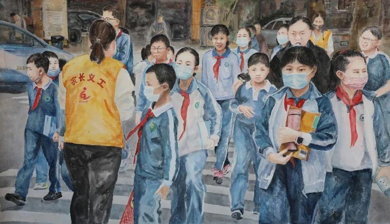 李岳《斑马线上的守护》75×120cm 纸本水彩 2021年