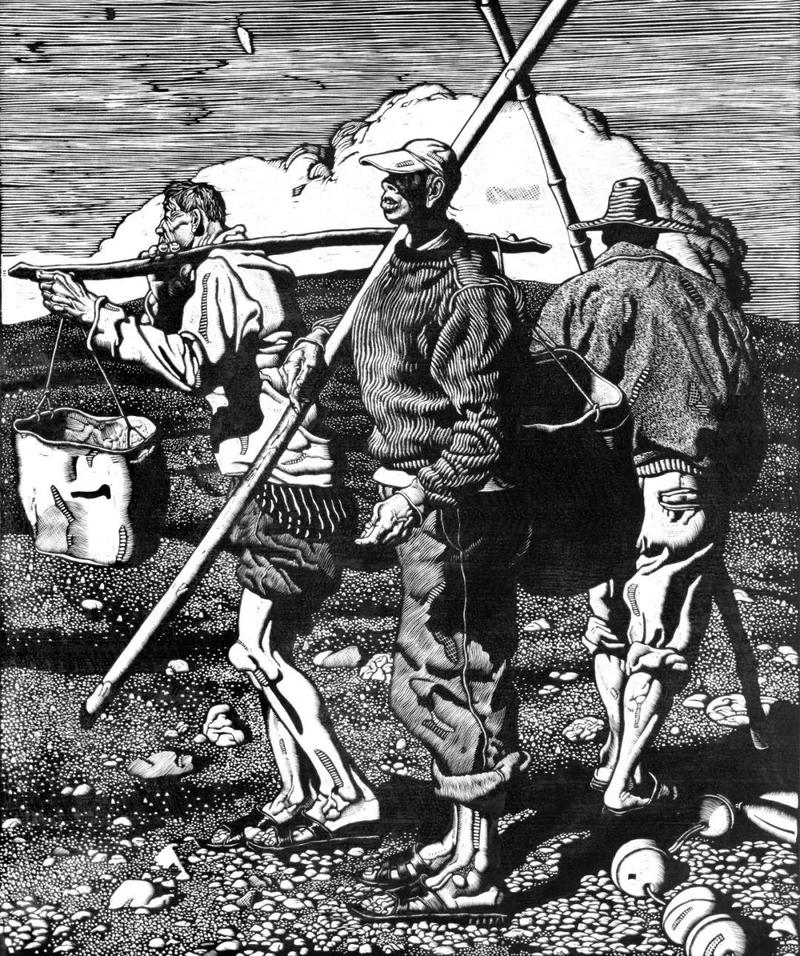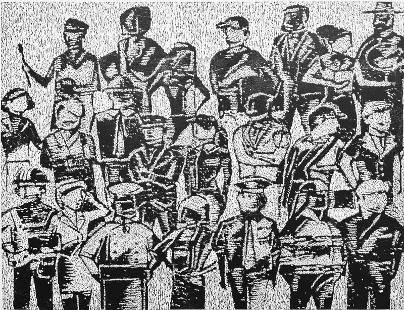 陆声设《三人行》115×100cm 木刻版画