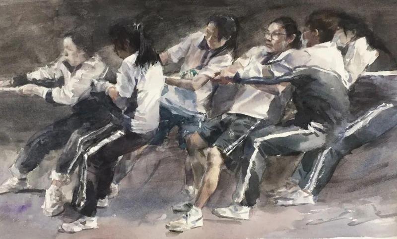 卢卫文《拨河比赛》52×73cm 纸本水彩 2021年